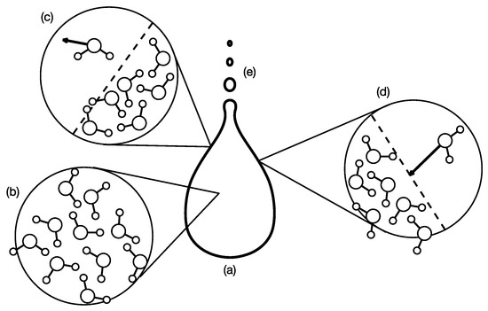 (a) A macroscopic raindrop with its characteristic teardrop shape falling through air. (b) The raindrop consists of a large number of microscopic water molecules whose relative positions are always changing. (c) Every now and then, a water molecule will escape from the surface of the raindrop (shown as dashed line). (d) Sometimes, the raindrop (whose surface is shown as a dashed line) can also absorb a water molecule from the air around it. (e) If the raindrop falls too fast, its surface will become unstable, and the trailing end of the raindrop may breakup into smaller droplets.