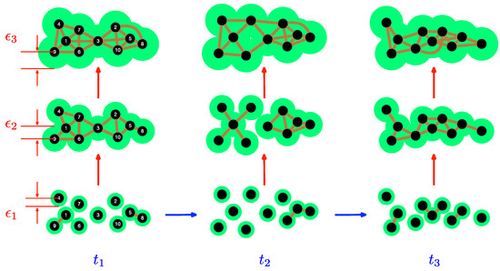 The simplicial complexes obtained by the TDA filtration process for a set of ten data points at three different scales (the sizes of the green disks), at three different times . In this figure, two data points and are connected, if .
