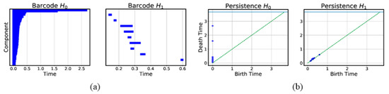 b) The persistence diagrams of the 0-dimensional and 1-dimensional components emerging from the filtration process.