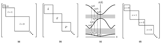 (a) The matrix representation of the angular momentum operator is block-diagonal when it is written in the basis of eigenstates of . Within a diagonal block, all states have eigenvalue for , and eigenvalue , for . (b) For the Hamiltonian matrix of a crystal in momentum space, we find one diagonal block associated with each wave vector . (c) When we diagonalize the block-diagonal matrix shown in (b), we find the eigenvalues organized into bands separated by band gaps (gray). (d) For a network with community structure, the adjacency matrix or the Laplacian matrix is also block diagonal, with each block associated with a different community with community index .