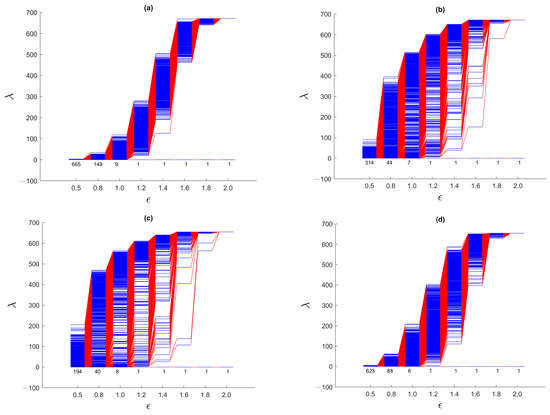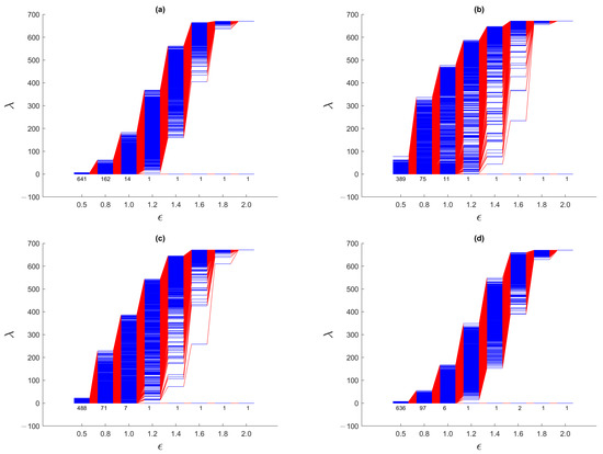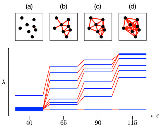 A set of eight data points going through the filtration process, and the resulting Laplacian spectra (blue horizontal lines) for filtration parameters (a) , (b) , (c) , and (d) . Thin blue lines tell us that the eigenvalues are nondegenerate, whereas thick blue lines indicate that the eigenvalue is degenerate. We use red lines to connect to , for successive filtration parameters .