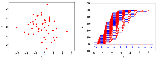 (left) A cluster of 50 data points sampled from a two-dimensional normal distribution where and is a diagonal covariance matrix with diagonal matrix elements and . (right) The spectral sequence (i.e., the distribution of eigenvalues of the Laplacian matrix at different filtration parameter ) of this cluster. In this figure, the numbers of zero eigenvalues for different are indicated below .