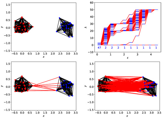 (top right) The spectral sequence for two clusters, one with 30 red data points, the other with 20 blue data points. In this figure, the persistent spectral gap that corresponds to this spatially persistent two-cluster structure is shaded yellow. (top left) The simplicial complex of the two clusters at , which consists of the two nearly complete networks that are not connected. (bottom left) The simplicial complex of the two clusters at , showing how the red cluster is connected to the blue cluster by 9 links, between 5 red nodes and 5 blue nodes. (bottom right) The simplicial complex of the two clusters at . At this length scale, the two clusters are connected by 261 links. In these figures, intra-cluster links are black, while inter-cluster links are red.