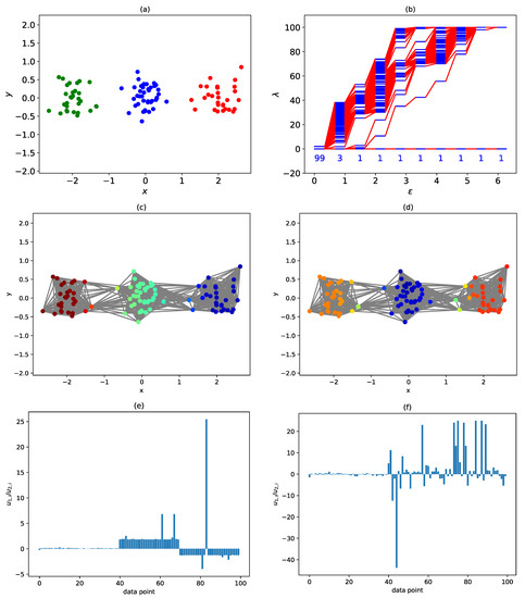 b) The spectral sequence of the three clusters of data points. Note the sudden change from a three-cluster description at