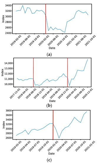 Monthly values of (a) the Straits Times Index (STI) of the SGX, (b) the Taiwan Capitalization Weighted Stock Index (TAIEX) of the TWSE, and (c) the Standard & Poor’s 500 (S&P 500) between 1 January 2019 to 31 August 2021, 1 January 2018 to 31 December 2020, and 1 June 2019 to 31 December 2020 respectively. We are specifically interested in two market crashes (Sep 2018 and March 2020) on the TWSE, one market crash (Mar 2020) on the SGX, and one market crash (Mar 2020) for the S&P 500. In these figures, these are shown as red vertical lines.
