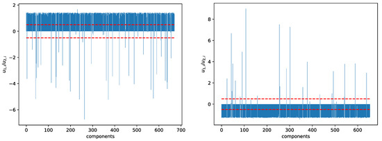 Bar plot of the ratio of components of the eigenvectors and associated with the smallest non-trivial eigenvalues and of the graph Laplacian obtained at filtration parameter , in (left) the 22 September 2019–22 March 2020 time window, and (right) the 15 October 2019–15 April 2020 time window. In this figure, components between the two red dashed lines are likely to be members of a bridging cluster.
