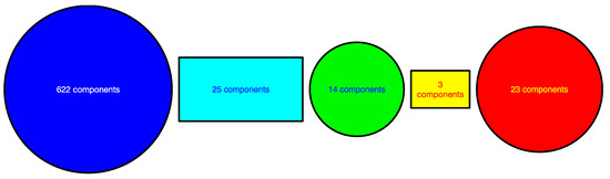 Schematic figure showing the major cluster (blue, 622 components) being linked to the minor cluster (red, 23 components) through a bridging cluster (green, 14 components) in the 22 September 2019–22 March 2020 time window. In the cyan neck between the blue and green clusters, there are 25 components. In the yellow neck between the green and red clusters, there are three components.
