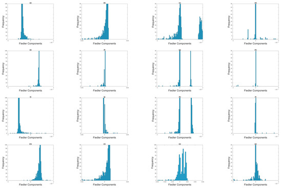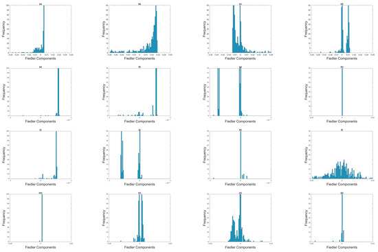 Distribution of Fiedler components at different filtration parameters: (first row) (a) , (b) , (c) , and (d) for the 8 April 2018–8 October 2018 time window; (second row) (e) , (f) , (g) , and (h) for the 22 August 2018–22 February 2019 time window; (third row) (i) , (j) , (k) , and (l) for the 1 October 2018–1 March 2019 time window; and (fourth row) (m) , (n) , (o) , and (p) for the 1 November 2018–1 April 2019 time window.