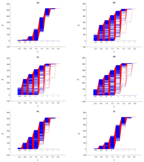 The spectral sequences of the TWSE for over the six-month time windows: (a) 1 August 2019–31 December 2019, (b) 8 October 2019–8 March 2020, (c) 8 November 2019–8 April 2020, and (d) 22 February 2020–22 August 2020, and (e) 8 March 2020–8 September 2020, and (f) 8 April 2020–8 October 2020. During the March 2020 STI crash, the STI fell from a high of 3220 on 9 February 2020 to a low of 2410 on 15 March 2020.