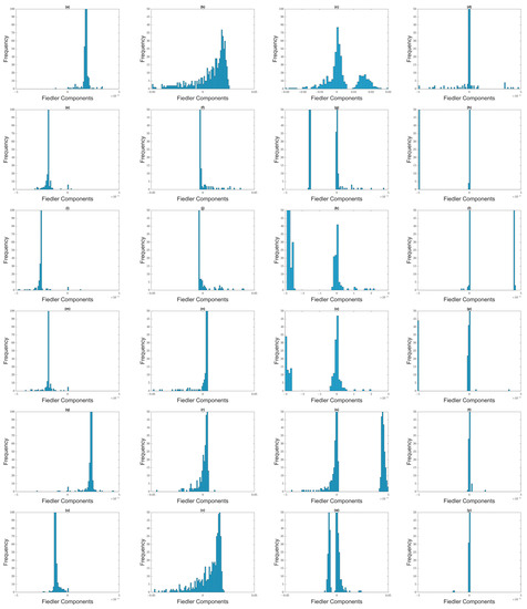 Distribution of Fiedler components at different filtration parameters: (first row) (a) , (b) , (c) , and (d) for the 1 August 2019–1 January 2020 time window; (second row) (e) , (f) , (g) , and (h) for the 8 October 2019–8 April 2020 time window; (third row) (i) , (j) , (k) , and (l) for the 8 November 2019–8 May 2020 time window; (fourth row) (m) , (n) , (o) , and (p) for the 22 February 2020–22 August 2020 time window; (fifth row) (q) , (r) , (s) , and (t) for the 8 March 2020–8 September 2020 time window; and (sixth row) (u) , (v) , (w) , and (y) for the 8 April 2020–8 October 2020 time window.
