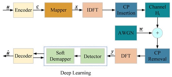 In this paper, we propose a Transformer-based detection/demapping algorithm for the mobile coded OFDM system. Although there are some studies on deep learning for channel coding [19] and decoding [20,21,22,23], the performance is not satisfactory when decoding directly via DL, especially regarding the long capacity-approaching codes. In this paper, we employ the low-density parity check (LDPC) codes, and the soft information given to the conventional belief propagation (BP) decoder is computed by deep learning. The main contributions of this paper are as follows: