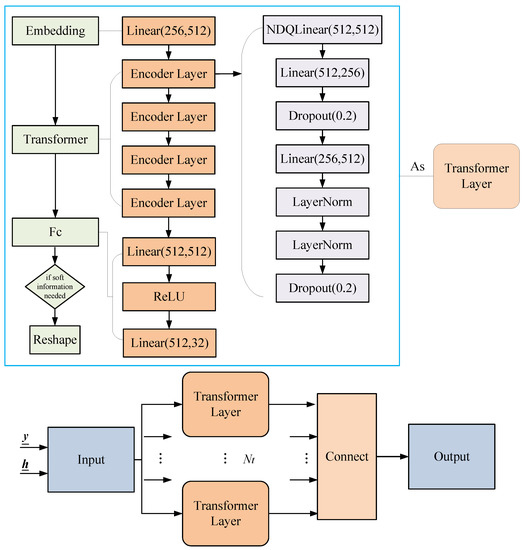 The Transformer network structure is related to the input and output dimensions; see Figure 3. The Transformer model used consists of Transformer layers, each of which is composed of an embedding layer, a Transformer layer, and a fully connected layer. The Transformer consists of NDQLinear, Linear, LayerNorm, and Dropout layers, with neuron numbers of 512, 512, and 256, respectively. The number of input layer neurons corresponds to the sum of the real and imaginary parts of two OFDM signals, and the output corresponds to 16 bits. Since the data signal is modulated using QPSK with 64 effective subcarriers and a total of 128 bits, 8 independent networks are required, which are then concatenated for the final output. The hidden layers of the network use ReLU as the activation function.