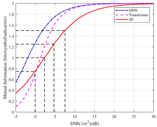In this example, the mutual information based on the type of detector, which can be regarded as SIQ, versus the SNR is as depicted in Figure 6. For the ZF detector, we can observe that the Shannon limit for QPSK to achieve the spectral efficiency of 0.75, 1.0, 1.25, 1.5 bits/symbol/subcarrier is approximately −0.1, 2.3, 4.7, 7.5 dB, respectively. With the probability generated by the softmax function for the DNN and Transformer, their SIQs are higher than that of the conventional detector in the high SNR region. In the following examples, we take the ZF Shannon limit as a benchmark for comparison.