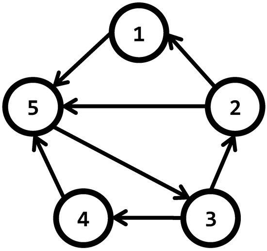 When information flows only in one direction through every edge, the graph is called a directed graph, or digraph. In Figure 3, the arrows in the edges indicate the direction of the information. For digraphs, the adjacency matrix takes into account the nodes from which node i can retrieve information. Equation (11) describes the adjacency matrix corresponding to the digraph of Figure 3
