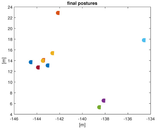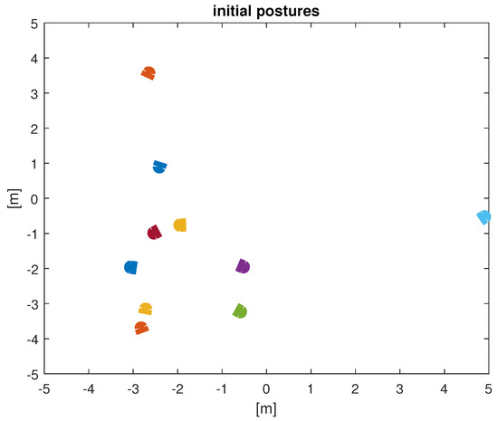 To assess this controller, a numerical simulation was performed. To achieve this goal, a script was developed in Matlab version R2018a, using a PC with Windows 10, 11th Gen Intel i5 processor, and 16 GB of RAM. The simulation scenario included a group of ten UAVs with nonholonomic constraints, described by (4), coupled with their five nearest neighbors. The initial positions and orientations were selected randomly over the workspace, and are depicted in Figure 4.