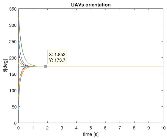 The experiment lasted 10 simulation seconds, with a sample period of 10 ms. The UAVs were set to travel at a fixed linear velocity of 15 m/s, over an obstacle-free plane, and their orientation was governed by the control law (14), with . In every time step, all drones identified their 5-NN, in order to obtain , as stated before, due to the constant travel of the UAVs, the neighborhood of every UAV is constantly changing. After 1.5 s of simulation time, the orientation of the 10 UAVs was synchronized to 173.7 degrees, as shown in Figure 5. The RMS error of orientation between the drones, is used as a metric to evidence synchronization, and those errors tend to 0, as shown in Figure 6. The final positions of the UAVs are presented in Figure 7.