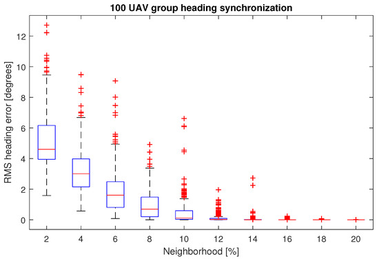 In the second simulation environment with a fixed neighborhood size, from Figure 9 it can be seen that the median RMS heading error of the 300 experiments is below 1 degree for a swarm up to 80 UAVs, while for the bigger swarm, the median RMS heading error is 1.32 degrees.