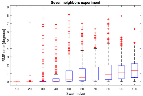 The boxplot of Figure 8, shows the RMS errors obtained at s for the 300 experiments applying the first scenario. It is clear that when over 10% of the group size is part of the neighborhood, synchronization is achieved. However, the median RMS error of an 8-NN, is 0.69 degrees, while the corresponding value for a 10-NN, is 0.115 degrees. In practice, we can consider a successful synchronization from 8-NN. Even more, the results for this particular neighborhood size are more concise, because they have fewer outliers than the 10-NN case.