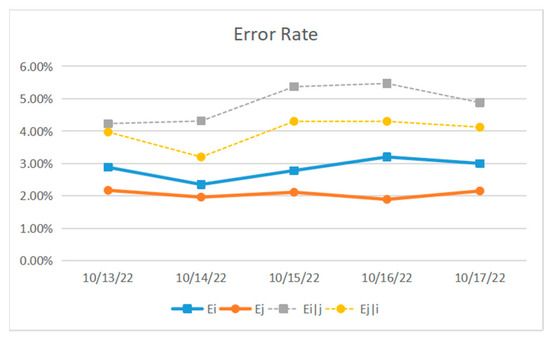 In order to explore the reason for crosstalk in scheduling strategies, this paper adopts the random benchmark test (RB) [26,27] to evaluate the quantum gate error rate. In the random benchmark test (RB), the error rate of a single quantum gate , which is not affected by other quantum gates, is called the independent qubit error rate . When and are measured simultaneously, the error rate of is called the conditional error rate , while the error rate of is called the conditional error rate . Its symbols and contents are shown in Table 5.