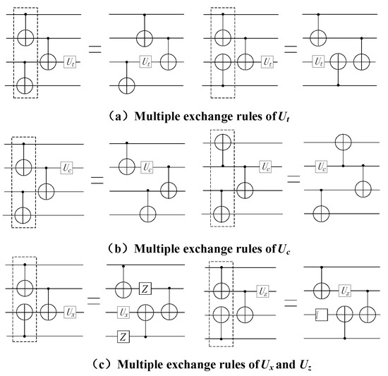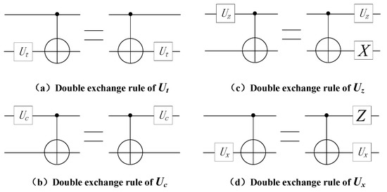 It is proved that if the unitary matrixes of quantum circuits are equal, they are functionally equivalent [18]. Therefore, we calculate the unitary matrix on both sides of the equation. For gate in , The unitary matrix on the left of the equation is (1). The unitary matrix on the right of the equation is (2), because (1) is equals (2). The equation holds. □