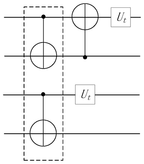 For gate in , the unitary matrix on the left side of the equation is the left side of (4), The unitary matrix on the left side of the equation is the left side of (4). Because their unitary matrices are equal, the equation holds. □