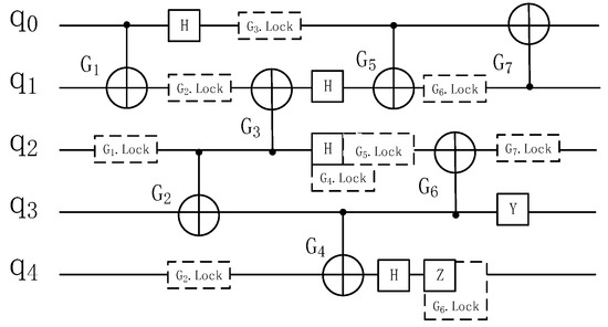 For gate in , the unitary matrix on the left side of the equation is the left side of (5). The unitary matrix on the left side of the equation is the left side of (5). Because their unitary matrices are equal, the equation holds. □