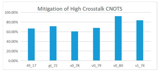 Due to the defects in the hardware of quantum computing devices, all kinds of noise will be generated when the quantum computing devices execute, which makes the fidelity of quantum computing devices fail to reach the ideal state. High crosstalk is a major source of noise [12,23]. The method proposed in this paper can separate the double quantum gates with high crosstalk before the quantum computing equipment is executed and reduce crosstalk. Figure 15 shows crosstalk mitigation information for multiple reference circuits. The results show that the proposed method can effectively reduce the crosstalk in the line, and the average optimization rate reaches 79.78%.