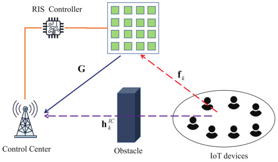 where , , and denote the channel gain coefficients between device k and the CC, the RIS and the CC, and device k and the RIS, respectively. , and are modeled as , and where is the path loss at the reference distance . , and represent communication distances between device k and the CC, the RIS and the CC, and device k and the RIS, respectively. , and represent path loss exponents between device k and the CC, the RIS and the CC, and device k and the RIS, respectively. , and are assumed to be independent Rayleigh fading between IoT device k and CC, the RIS and CC, and IoT device k and the RIS, respectively. is the reflection coefficient matrix of the RIS. In general, is a diagonal matrix given by = with , where denotes the reflection coefficient at the m-th reflecting element, . For simplicity, (2) can be further rewritten as