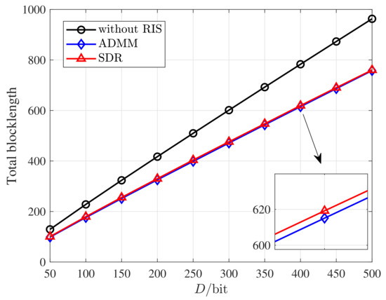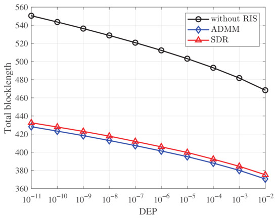 Figure 2 presents how the total blocklength varies with the maximum DEP under different algorithm strategies. For the sake of comparison, the performance without RIS and that solved by the SDR method is also plotted. As we can see from Figure 2, with RIS, the total blocklength significantly reduces compared to that without RIS. It can also be observed that the total blocklength reduces as the DEP increases. By noting that , where and are the transmission duration and the signal bandwidth of the k-th device, respectively, the blocklength is closely related to the transmission duration, which implies a trade-off between the latency and the reliability in the URLLC system. We can also observe from Figure 2 that our proposed ADMM-based method achieves a shorter total blocklength than the SDR-based method. When the number M of the reflecting elements on the RIS is large, the time complexity of our proposed ADMM-based method, i.e., is much lower than that of the SDR-based method, i.e., . We can then conclude that our proposed method achieves better performance than the conventional SDR-based method with much lower complexity.