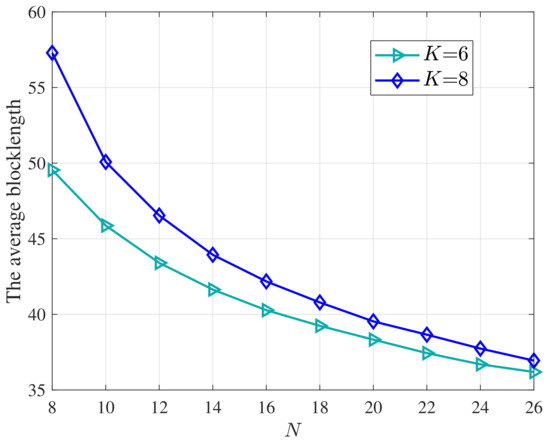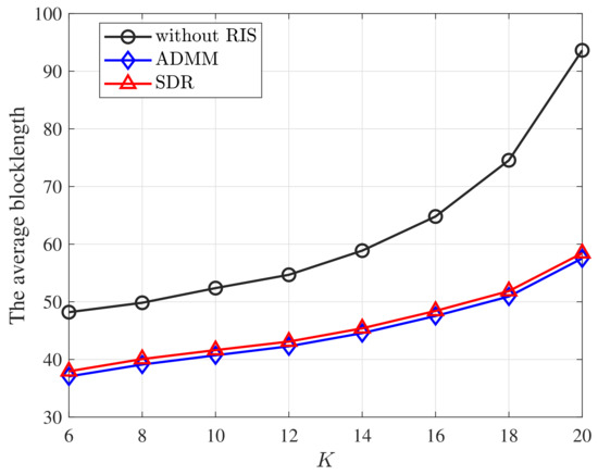 Figure 5 plots how the average blocklength, i.e., , varies with the number of devices K. As Figure 5 shows, the average blocklength increases with K, as more devices are competing for the fixed amount of communication resources. Note that the gap between that with and without RIS becomes larger with K, which further implies the importance of deploying RIS under the strict QoS constraint in the URLLC systems.