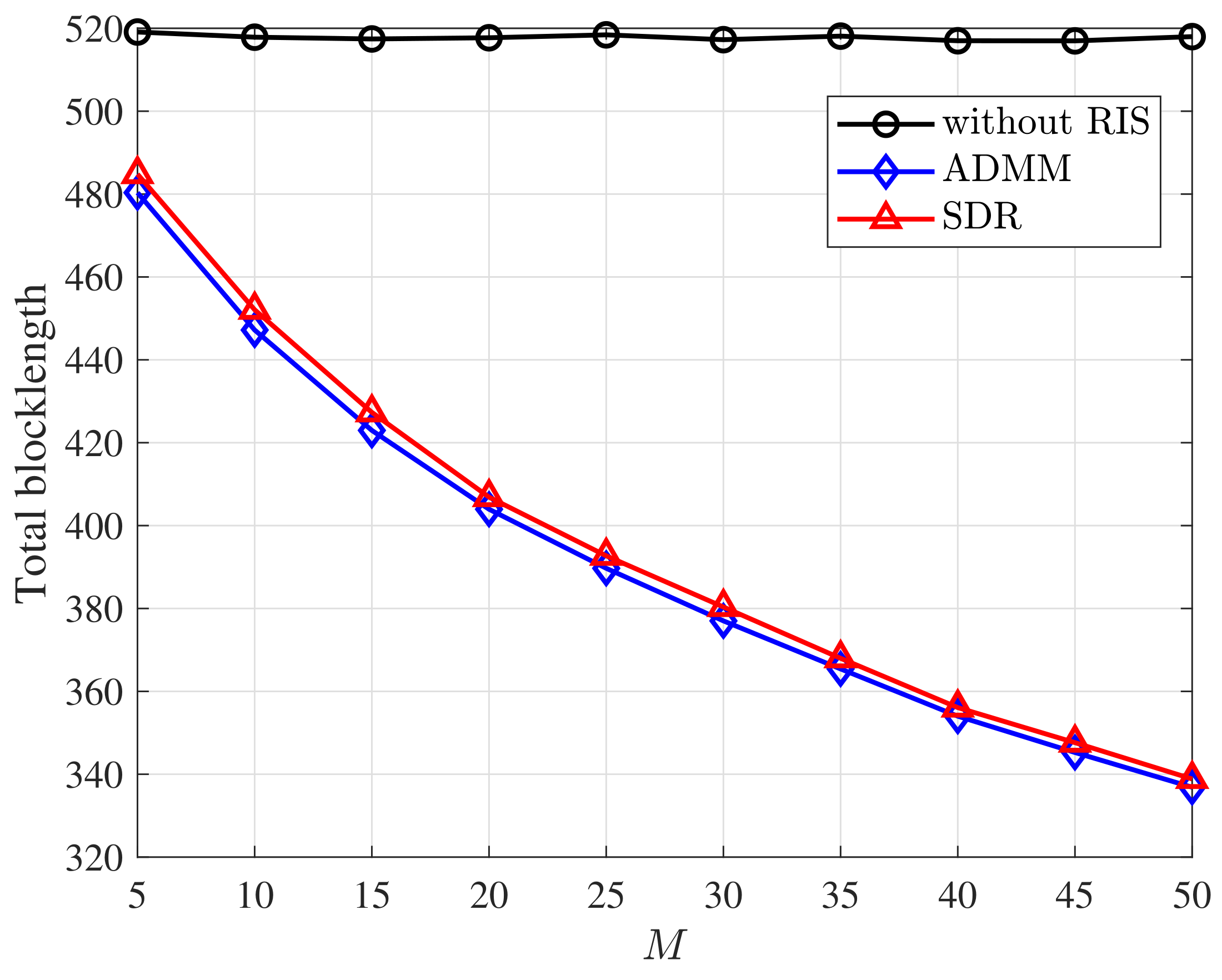 Figure 4 shows how the total blocklength varies with the number of reflecting elements. As Figure 4 shows, with RIS, the total blocklength decreases as the number M of the reflecting elements increases. When M is large, our proposed design is able to significantly reduce the blocklength and thus reduce the latency. It indicates that it is necessary to deploy an RIS with a large number of reflecting elements to improve the URLLC system performance.