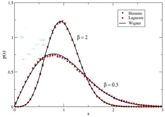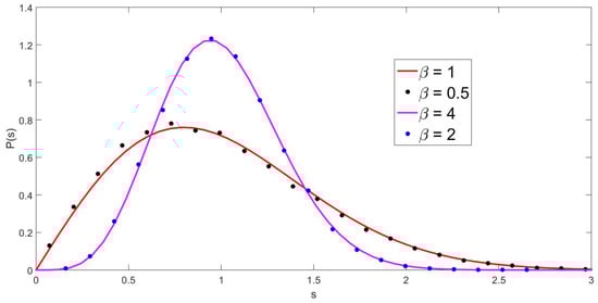 NNSD for 100 matrices of size 120 in which the even elements of the pseudo-Hermitian –Jacobi ensemble are sorted with (black and blue dots) for the indicated values of beta. The full lines were calculated with Wigner surmise, as seen in Equation (21), with and respectively.