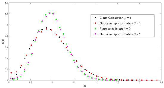 Comparison of the Gaussian approximation with the exact calculation of NNSD for and , as indicated in the figure.The calculations were performed with 50 matrices of size n = 450.