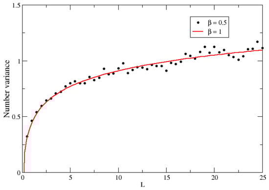 The verification of the 2 effect in the number variance statistics: black dots were calculated with 600 matrices of size n = 120 of the pseudo-Hermitian –Jacobi ensemble sorted with , and the red full line corresponds to the GOE number variance.