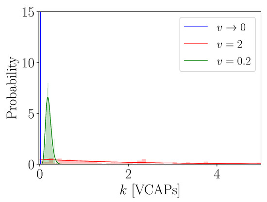 is the asymptote of (see Figure 3, blue distribution). Equation (35) tells us that V is partitioned into an infinite number of subvolumes, each containing an infinitesimally small number of VCAPs. This is because the mean value and variance of are proportional to v and , respectively, so that is translocated towards the origin while at the same time becoming increasingly narrow as v decreases for some finite value of K (see Figure 3). For , it is, thus, almost certain to find an infinitesimally small amount of VCAPs anywhere in V as if VCAPs were molecules of a well-mixed gas [27].