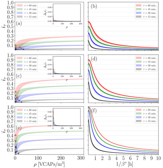 where (1/h) is a macroscopic rate designating the speed at which individuals are exposed to the virus via airborne transmission. It is common practice to consider substitution , where (VCAPs/h) is the rate at which VCAPs are emitted into V by an infectious occupant (i.e., VCAP exhalation rate), (m/h) is the rate at which a susceptible occupant breathes air from V (i.e., volumetric inhalation rate), and (m/h) is the rate at which clean air is supplied to V by a ventilation system [27]. The total number of VCAPs exhaled and inhaled during t by infectious and susceptible occupants is then given by and , respectively, and the steady-state VCAP density reads [27]