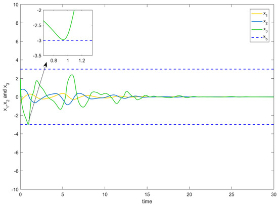 In order to avoid uncontrollable situations, our initial values are chosen to be within the state constraints, namely, , , . Within the above range, the initial value can be chosen arbitrarily. Regarding other parameters, the case of setting is not unique. Since we only need to justify the theory presented in this paper, all it takes is the existence of a situation in which it holds. The specific setting of the parameters varies with the case of the dynamic equations.