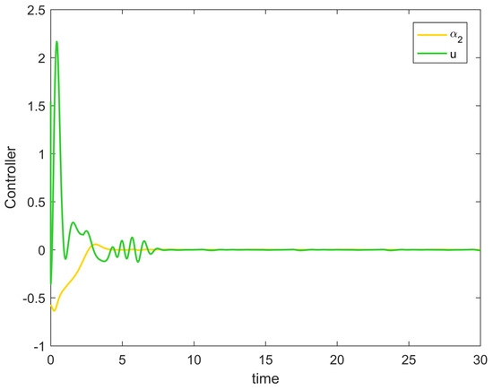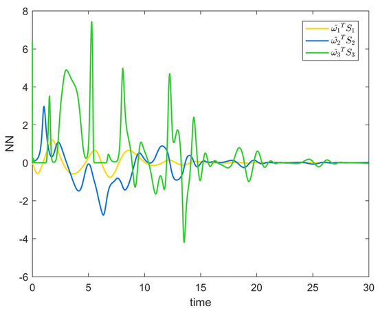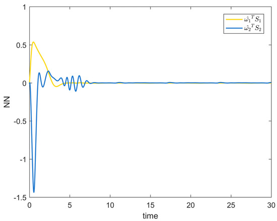Figure 8 shows the variation curves of the system state variables over time under the full-state constraints. Figure 9 shows the variation curves of the designed virtual controller and the actual controller over time. Figure 10 depicts the variation curves of the attack compensator over time. Figure 11 depicts the variation curves of the unknown nonlinearity of the RBF neural network approximation system. From the figures below, it can be seen that the curves all trend from violent vibration to gradual convergence, indicating that the method proposed in this paper can effectively combat unknown deception attacks under the condition of full-state constraints. It enables the chemical reactor recovery system to converge to the equilibrium state quickly even after the external spoofing attack.