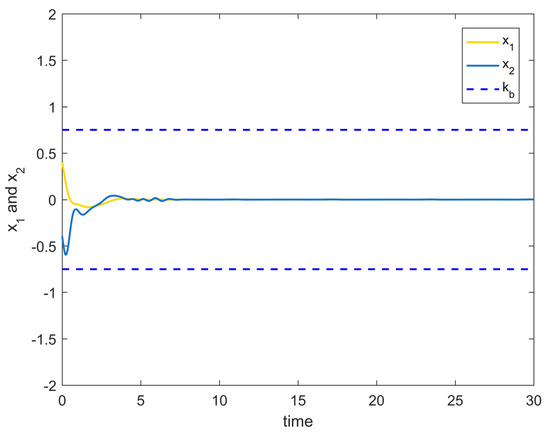 The initial values of the system state variables are selected to be for the system described in (73), it is very important to note that the initial values are chosen in such a way that they do not violate the state constraints, that is, and . Their coefficients are , , , , , , , , , , . Neural networks and have , neurons respectively, and and , respectively, are the widths of their receptive fields. For the first neural network , the centers of its receptive domain are , , ; for the second neural network , the centers of its receptive domain are distributed in the grid .