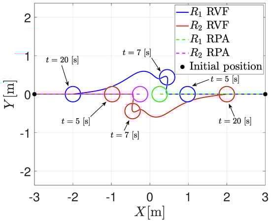 The first numerical simulation consists of the position interchange of two agents with a radius of [m]. In this sense, the initial positions of the agents are and ; the communication topology is an undirected graph, where the formation vectors are given by and . The sensing distance is set to [m]; the safety distance is set to [m]; and the bounds of the saturation functions are , and [m/s]. With these parameters, ; therefore, one sets . Figure 1 depicts the trajectory comparison between the RVFs and the RPA of both agents in different time instances. Note that when using the RVFs approach, the agents are coming closer to each other; each agent enters the sensing distance; the RVFs activate; and the agents perform collision avoidance. Once the agents are outside the sensing distance, the formation control prevails, and the agents reach the desired formation. On the other hand, when using the RPA, it is possible to note that the agents fail in the simplest collision avoidance case, i.e., they get stuck into an undesired equilibrium point. Under this scenario, it is clear that the proposed methodology obtains better results than the one proposed by Tatsch [34].