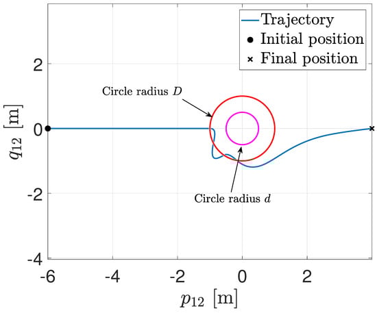 Figure 2 illustrates the trajectory in the plane , where the origin means that the agents collide. The circle in red is the sensing distance, while the magenta circle is the safety distance. When the trajectory enters the sensing distance, the RVFs are activated, and the collision is avoided.