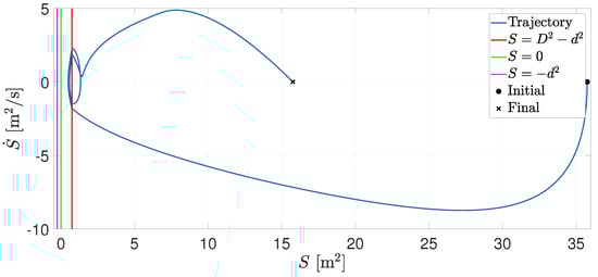Figure 3 presents the trajectory in the plane . Note that is negative when the agents approach each other. When , the RVFs are activated, and collision avoidance is performed.