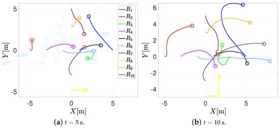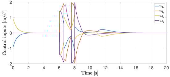 Finally, the control inputs required to perform the agents’ motion are illustrated in Figure 5. Note that when the RVFs are activated, the control inputs increase their magnitude (between 6 and 9 [s]), but they remain bounded, i.e., .