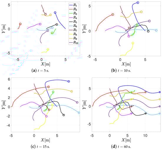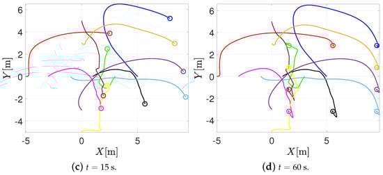 This numerical simulation consists of 10 agents moving on a horizontal plane. The initial positions of the agents are , , , , , , , , and ; the communication topology is a mixed graph, where the formation vectors are given by , , , , , , , and . The sensing distance, the safety distance, and the bounds of the saturation functions are the same as in the previous simulation. With these parameters, ; therefore, one sets . Figure 6 depicts the trajectory in the plane of the agents when using the RVFs approach. Once again, note that when the agents come closer to each other, each agent enters the sensing distance; the RVFs are activated; and the agents perform collision avoidance. Once the agents are outside the sensing distance, the formation control prevails, and the agents reach the desired formation.