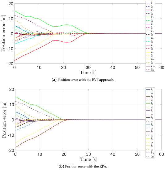 The position errors are illustrated in Figure 8a for the RVFs approach, while Figure 8b presents the positions error for the RPA. In both cases, it is clear that their positions converge to zero, and therefore, the agents achieve the desired formation.