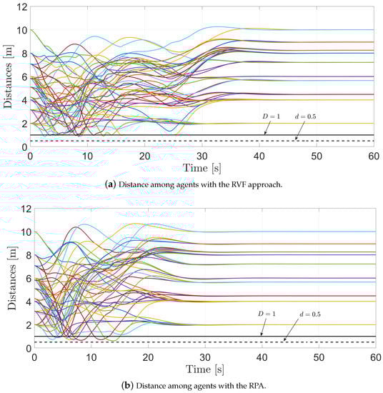 Figure 9a shows the distance among the agents when using the RVFs approach, while Figure 9b depicts the distance among the agents with the RPA. It is worth pointing out that when using the RPA, some of the distances among the agents are closer to the safety distance. In both cases, it is worth mentioning that when the agents are at risk of collision, the RVFs and the RPA activate, and the agents achieve collision avoidance. In this sense, the distance among the agents is greater than the safety distance [m].