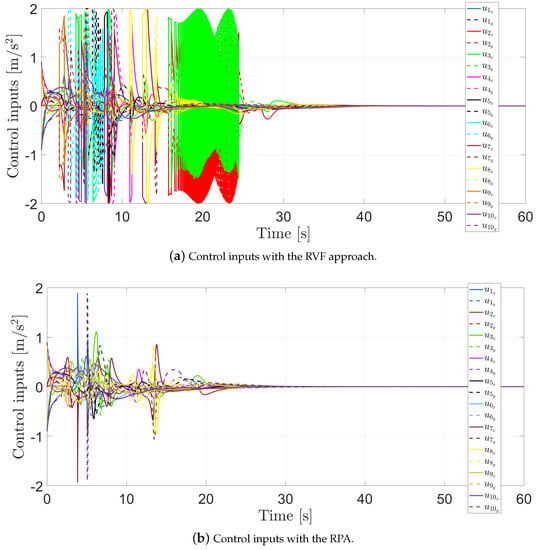 Finally, Figure 10a presents the control inputs required to perform their motion with the RVF approach, while Figure 10b shows the control inputs required to perform their motion with the RPA. Note that when the agents are at risk of collision, the control input magnitude increases. Furthermore, when using the RVFs approach, chattering effects appear in the signals. This comes from the fact that the RVFs are discontinuous and, therefore, the RVFs are turning on and off constantly until the agents escape the sensing distance. In both cases, the control inputs remain bounded, i.e., .