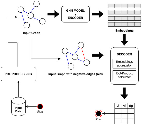 The proposed solution uses a Decoder, to perform the link predictions via binary classification. It needs a set of negative links that are randomly included into the validation and testing sets; these are excluded from the training set to evaluate only the original graph structure.