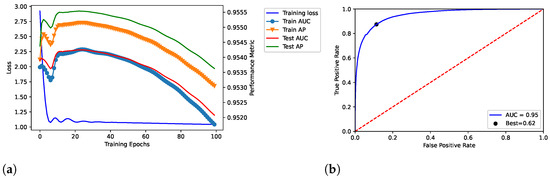 The model related to the proposed solution reported very satisfactory performance. According to the loss curves (training loss, train AUC, train AP, test AUC, and test AP) as reported in Figure 2a, Figure 3a, and Figure 4a, the proposed model was able to identify positive links with high sensibility, without interference from the negative links and by reporting a low number of false positives. The related values of AUC are reported in Figure 2b, Figure 3b, and Figure 4b.