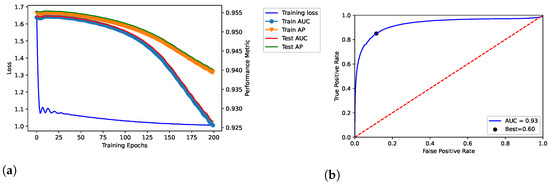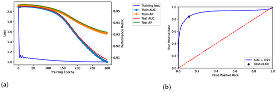 Dataset: DisGeNET. Training, validation and testing throughout 300 epochs; dataset: Curated-version. (a) shows the loss curve across the training process over the epochs. In addition, TPR and FPR were related through the ROC curve in (b), by also reporting the related AUC and best threshold (i.e., “Best”).